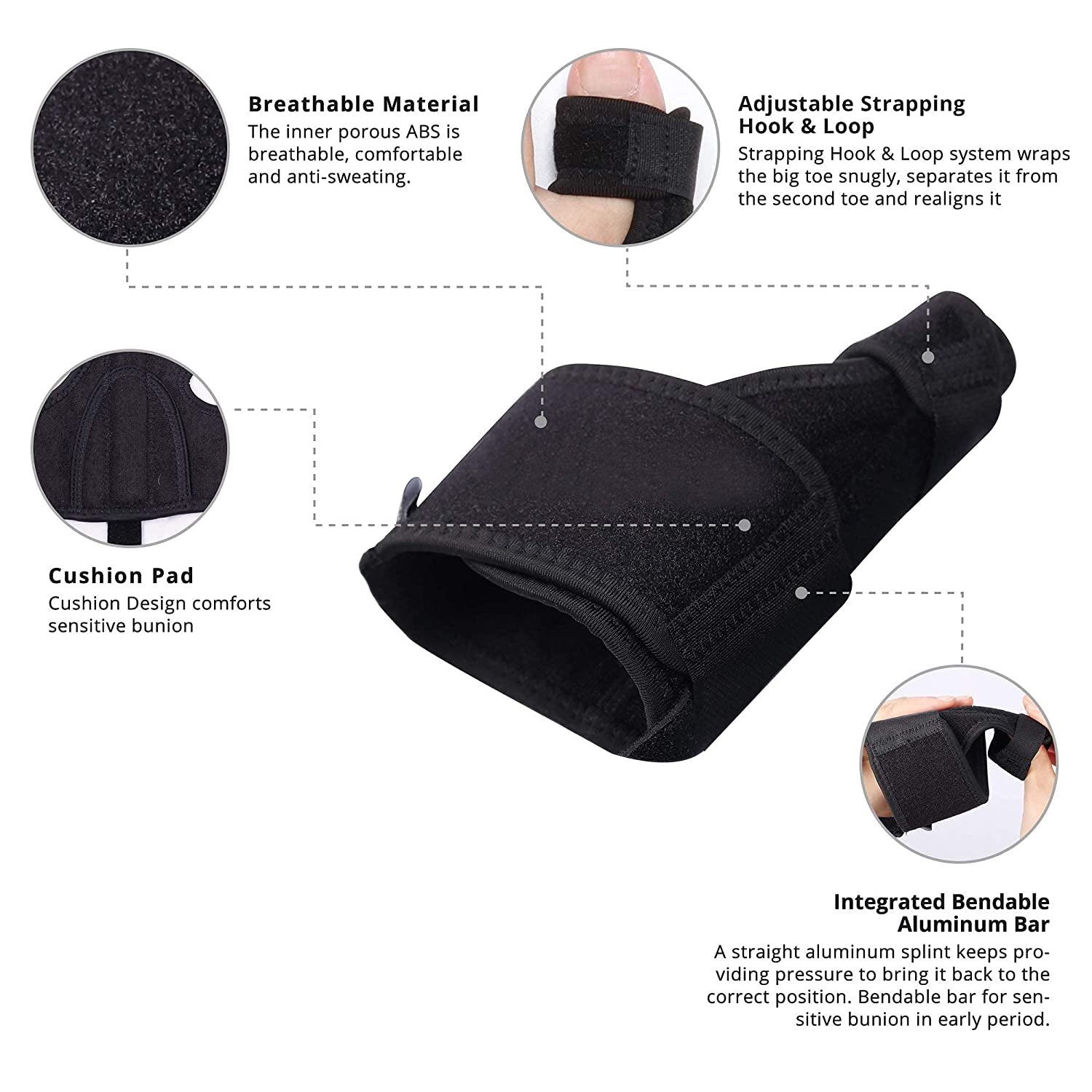 Providing protection and support, the bunion splint uses an integrated aluminum brace to supply constant gentle pressure on the big toe to realign it and slow the progression or formation of bunions.