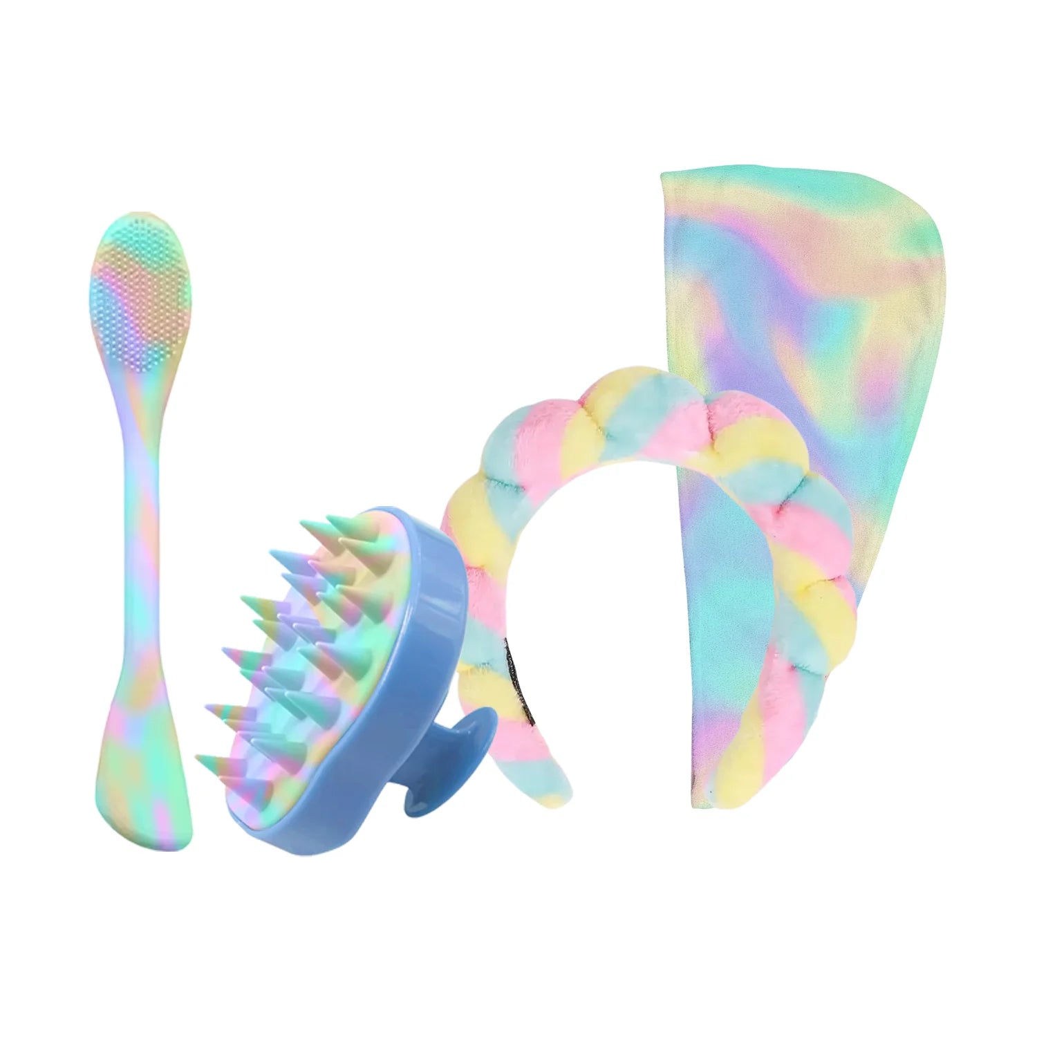 It includes a double-ended silicone face mask brush for flawless mask application and easy cleanup, a plush spa headband to keep your hair out of the way, a scalp massager brush that boosts circulation while you shampoo, and a super absorbent hair turban to wrap it all up. Easy to use, clean, and totally on-point for your next glow-up.